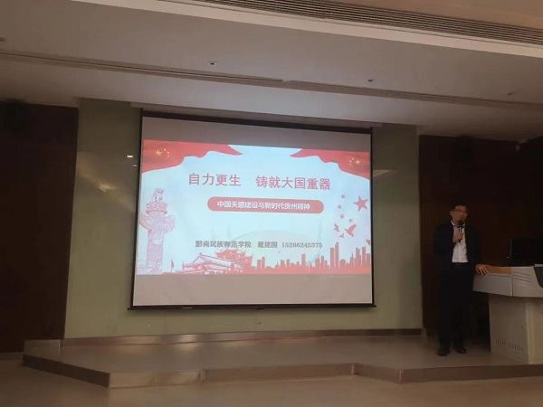 黔南民族师范学院马克思主义学院教授戴建国以《自力更生,铸就大国重器——中国天眼建设与新时代贵州精神》为题,从时代楷模和人民科学家、二十年执着于“天眼”、“天眼”与新时代贵州精神三个部分进行了讲授。