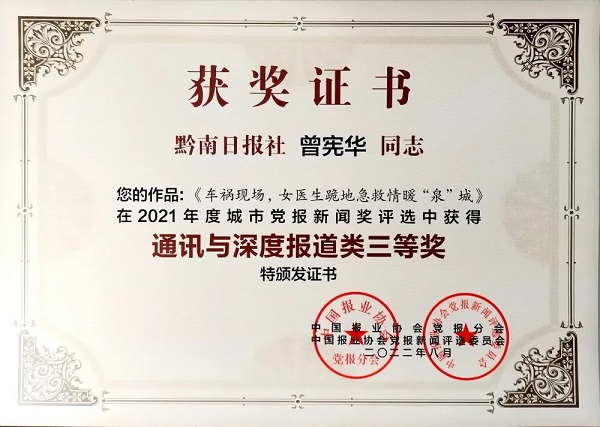 黔南州中医医院宣传报道《车祸现场,女医生跪地急救情暖“泉”城》荣获国家级新闻评选三等奖